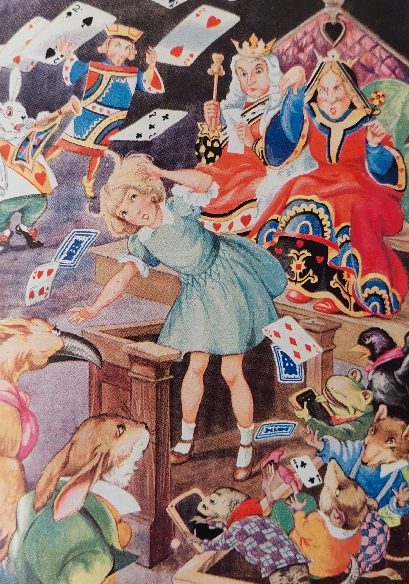 After denying the Queen, the pack of cards flies up in a flurry around her and she awakes in the lap of her older sister. Carroll notes that Alice has returned to her full size, symbolizing an end to her journey. She’s met all aspects of herself; chaotic and ordered, sorrowful and joyful, drowsy and alert, kind and unkind, just and unjust. Having faced these polarities in the underworld, she can now return to reality and continue the process of maturation. As in every true initiation rite, the novice brushes against death and emerges back into the living world transformed.