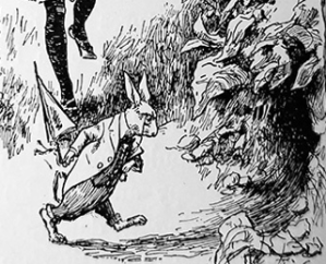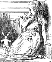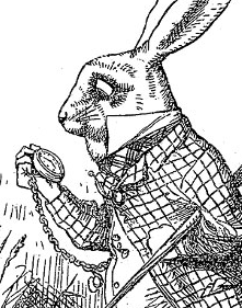 “There was nothing so VERY remarkable in that; nor did Alice think it so VERY much out of the way to hear the Rabbit say to itself, ‘Oh dear! Oh dear! I shall be late!’ … but when the Rabbit actually TOOK A WATCH OUT OF ITS WAISTCOAT-POCKET, and looked at it, and then hurried on, Alice started to her feet, for it flashed across her mind that she had never before seen a rabbit with either a waistcoat-pocket, or a watch to take out of it, and burning with curiosity, she ran across the field after it,”(Carroll ch.1)