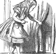 After her fall, Alice lands in a hallway full of locked doors and a single key. She has her first trouble, the key doesn’t fit any of the doors. After her second time around the room she finds a curtain that wasn’t there before, and behind it a small door. To her avail, the lock of the small door matches the key!