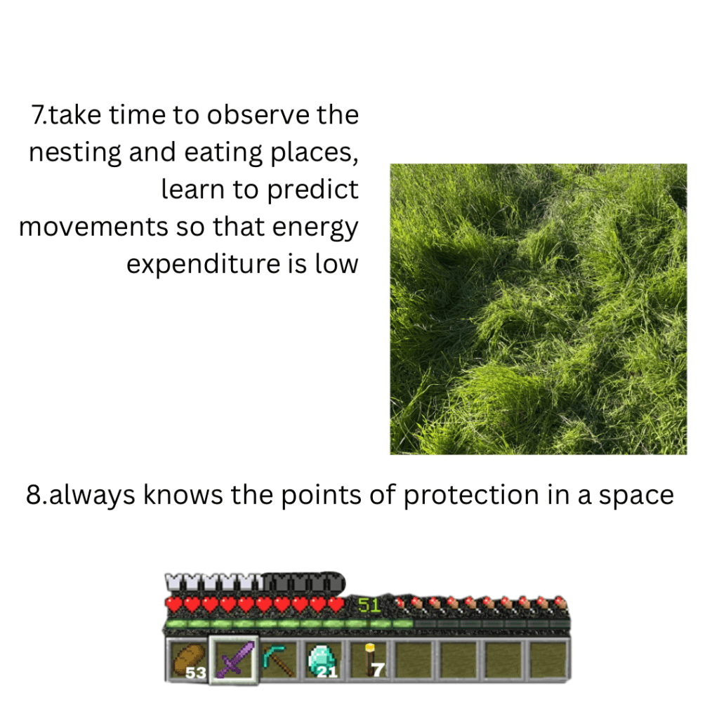 7. Take time to observe the nesting and eating places, learn to predict movements so that energy expenditure is low. Observation and attention to detail allows for more precise action. Precise actions allow you to hit your target while reserving as much of yourself as possible. Attention to detail will always keep you at the same pace as your prey, not falling behind or losing sight of them. A good hunter can predict the movements of his prey AND knows how to stay unpredictable so that he himself does not become prey.