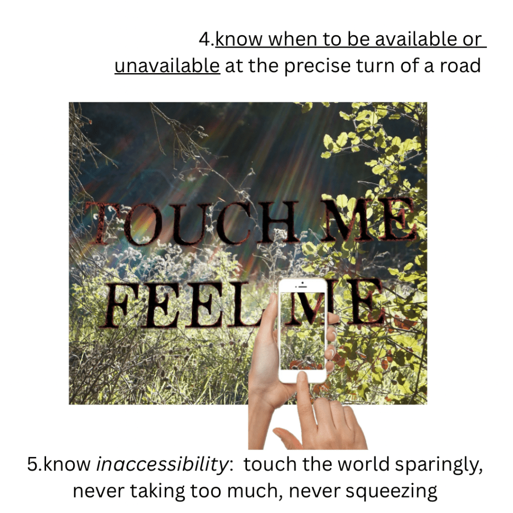 5. Inaccessibility: touch the world sparingly, never taking too much, never squeezing. A hunter only seeks what sustains him. He does not carry extra carcasses he cannot skin, preserve, and consume. Know what sustains you and keeps you happy, do not take on too much or that which you cannot tend to; lest it rot and weigh you down.